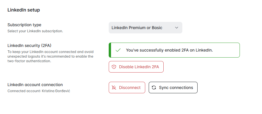 No problem. You can disable it anytime by heading back to the same spot and clicking Disable LinkedIn 2FA.