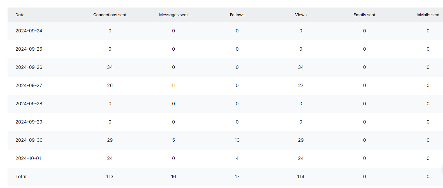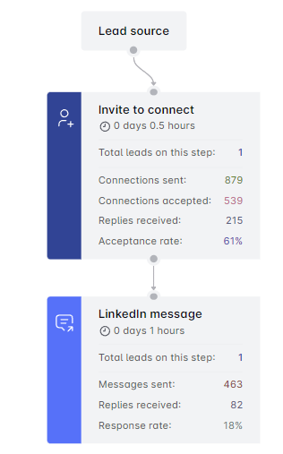 Scroll down for a detailed breakdown of each campaign step. See how many connections were sent, replies received, and emails/messages dispatched by Horion Marketing. It varies based on your campaign type and the steps included. Easily spot where your leads stand in the campaign.