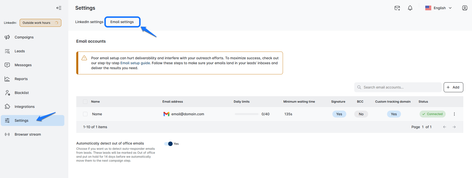 A custom tracking domain is important because it makes your email links look more professional and helps build trust with your prospects. Plus, it improves deliverability by aligning your links with your brand, which email servers like.