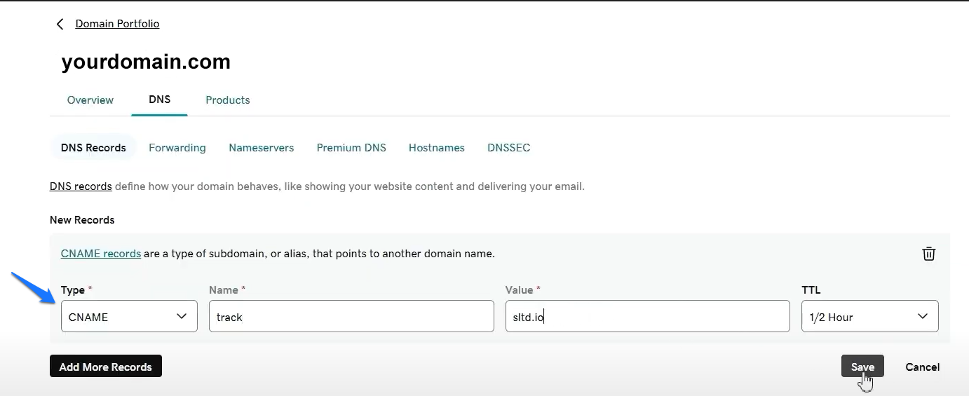 - This time, under record type in the dropdown menu, find CNAME, and paste the details provided in Horion Marketing’s Custom tracking domain settings.